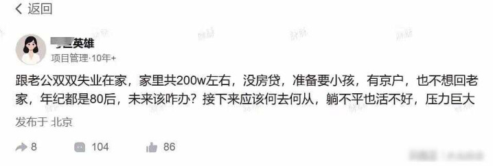 三月中旬,北京一对80后夫妻双双失业,丈夫三十八岁,妻子三十七岁,家里没有房贷压力,存着两百万积蓄,还持有北京户口,原本计划今年准备生育,却因收入突然中断,两人开始每天计算开支,越算心里越没底。